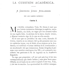 En 1889 el diario El Correo publica, con el título “Las mujeres en la Academia”, cuatro epístolas inéditas de Gertrudis Gómez de Avellaneda (Camagüey, 1814 – Madrid, 1873). Fechadas en 1853, su contenido gira en torno a las gestiones realizadas por esta poetisa y dramaturga nacida en Cuba con el objetivo de incorporarse a la Real Academia Española.