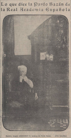 Cinco años después de su frustrado tercer intento por acceder a la Academia de la Lengua, Emilia Pardo Bazán concede una entrevista, con el título “Lo que dice la Pardo Bazán de la Real Academia Española”, que se publica, junto con una imponente foto de la escritora (firmada por Gonzáles), en la portada de El Día. Destacamos los siguientes fragmentos: